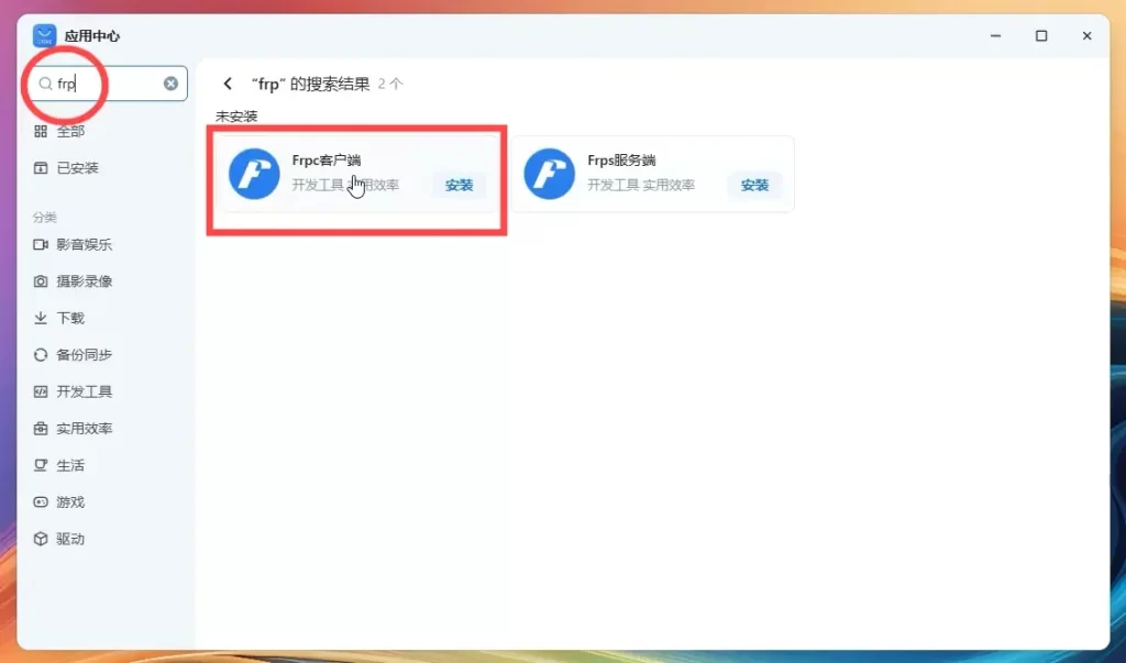 进入飞牛os后台,点击应用中心搜索frp,选择frpc客户端进行安装。自己设置一下安装位置
