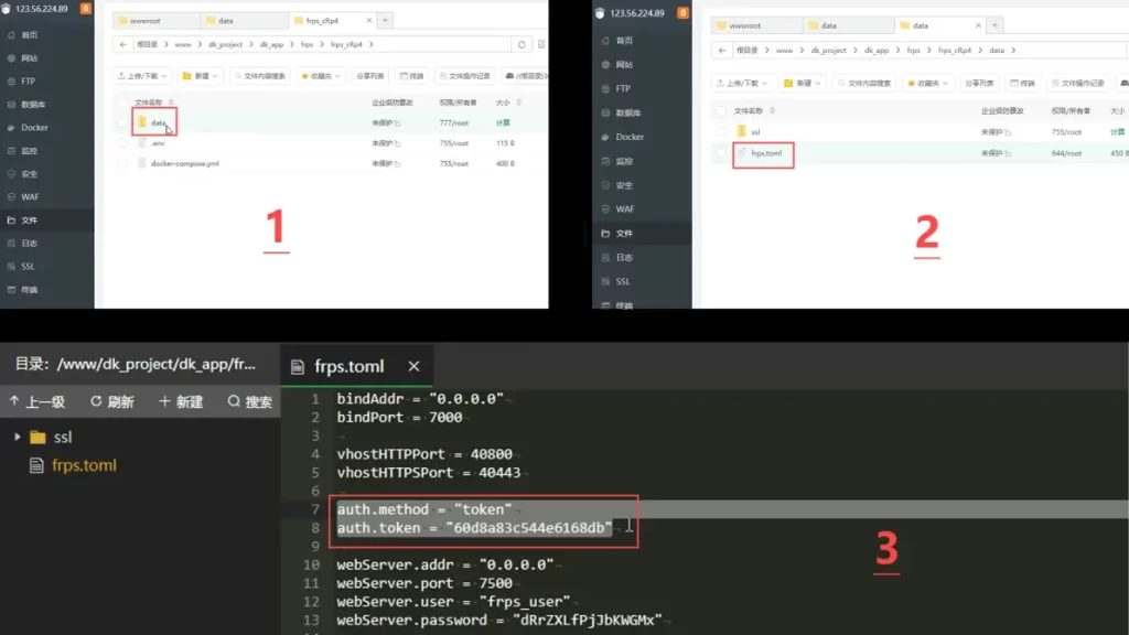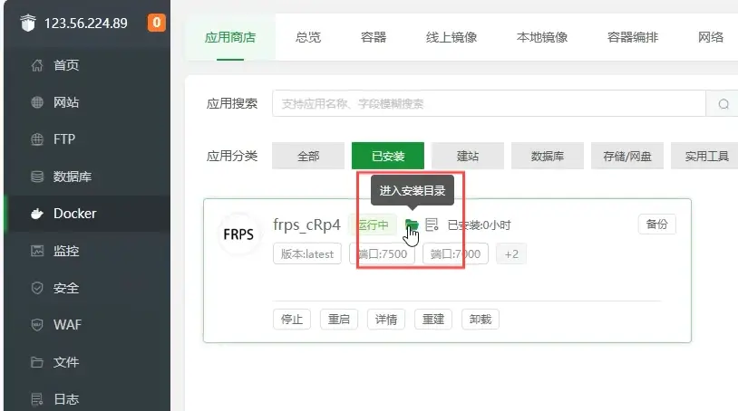 等待安装期间再回到宝塔面板docker界面,进入到frp服务端安装目录