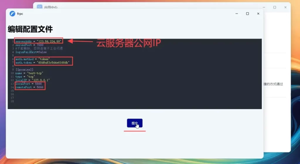回到飞牛frp客户端页面,点击打开。把上方IP改为服务器公网IP地址,再把刚才的token和密钥复制过来。下方第一个填写飞牛本地端口号,第二个是转发成云服务器公网IP后加的端口号,可以自行设置。最后点击提交就会生效。